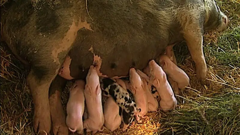 Stine er en økologisk gris, der har sit eget hus på marken. En sommerdag føder hun 12 små pattegrise. De har en sjov leg med at løbe hurtigt rundt efter hinanden. Sidst på sommeren skal Stine op på gården og parre sig med ornen igen. De små grise kommer i stald og bliver fedet op. Stine er gravid igen og flytter tilbage på marken, der nu er dækket af sne. Filmen giver et godt billede af, hvad det vil sige at være et bondegårdsdyr.