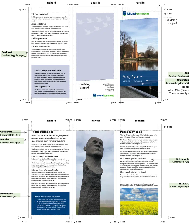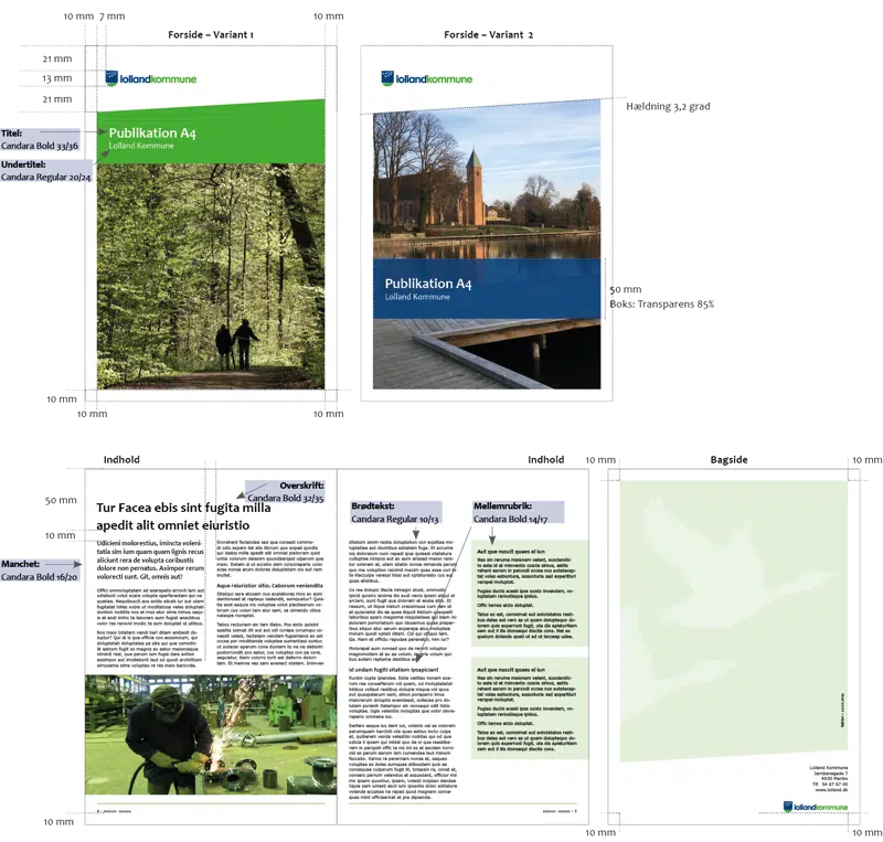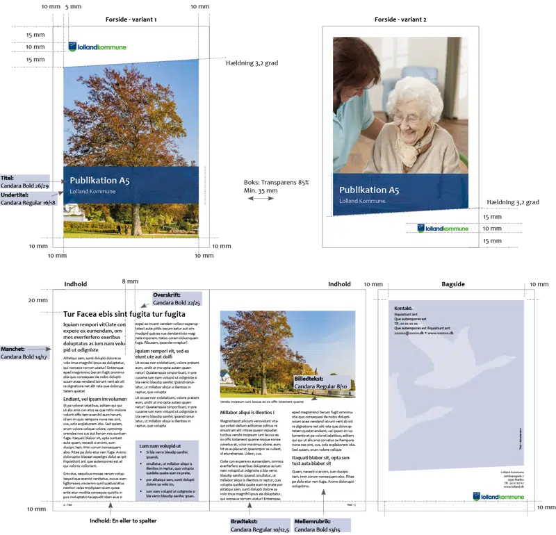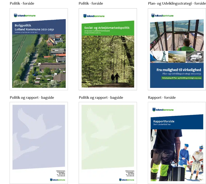 Der er udarbejdet retningsgivende skabeloner til opsætning af Lolland Kommunes publikationer i formatet A4 (210x297 mm), A5 (148x210 mm) samt M65 (99x210). Hent vejledningerne som pdf (til print) her.