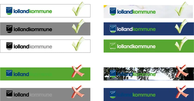 Hvis Lolland Kommunes logo placeres på en farvet baggrund, er det vigtigt altid at afstemme farvernes indbyrdes forhold, så Lolland Kommunes logo aflæses optimalt.