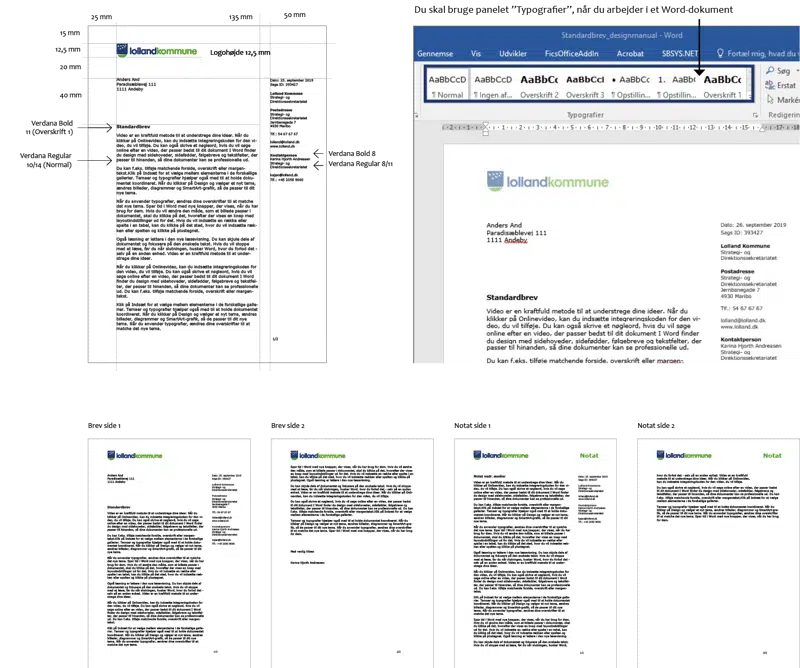 Breve, notater og øvrig korrespondance udarbejdes ved hjælp af elektroniske skabeloner, som oprettes via ESDH-systemet SBSYS eller Lolland Kommunes øvrige fagsystemer. På skabelonerne bruges skrifttypen Verdana, og på henholdsvis brev- og notatskabelon fremgår Lolland Kommunes horisontale logo i farver. Hent retningslinjerne for brev og notatskabelon til print her eller kontakt Lolland Kommunes kommunikationsafdeling for vejledning.