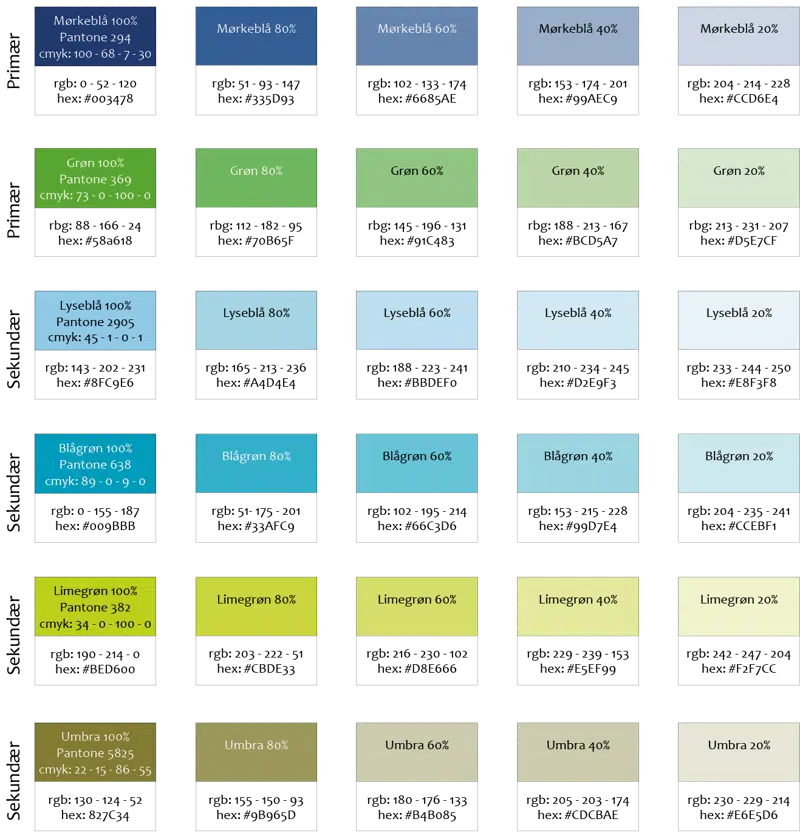 Ud over primærfarverne er der valgt en række sekundære farver, der kan suppleres med og bruges i forbindelse med grafer, baggrunde og anden grafik. Både de primære og de sekundære farver kan bruges i forskellige toningsgrader. Hent PDF med farvekoder her