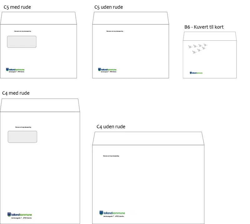 Eksempler på kuverter med Lolland Kommunes logo. Har du brug for kuverter med logo, kan du kontakte Lolland Kommunes trykkeri på Rådhuset i Maribo Tlf. 54 67 67 67.