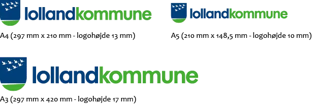 De foretrukne størrelser af Lolland Kommunes logo vises nedenfor. De er defineret i forhold til de mest anvendte papirformater. Det er vigtigt, at Lolland Kommunes logo synes ens i størrelse, når det optræder på en række materialer, der ses i sammenhæng.