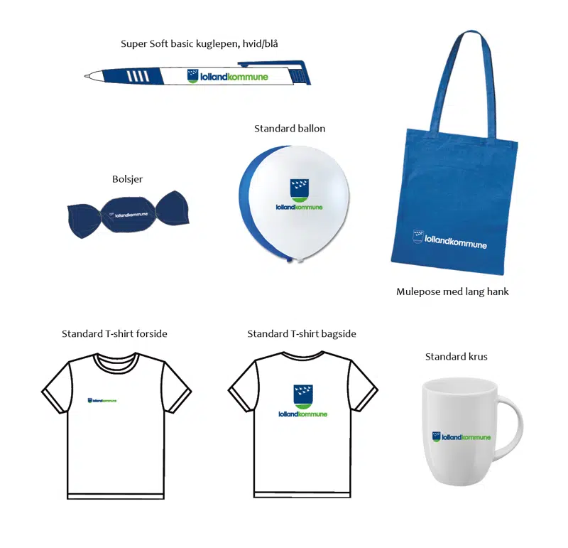 Herunder kan du se et udvalg af reklamemateriale og beklædning i Lolland Kommune.