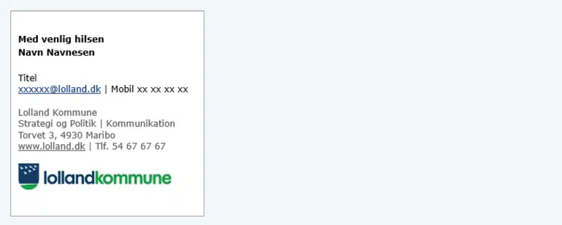Lolland Kommunes oficielle mailsignatur er lagt ind som en skabelon i Outlook. Som medarbejder i Lolland Kommune skal du altid bruge denne skabelon.