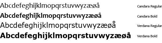 Candara og Verdana er primærtypografierne i Lolland Kommunes visuelle profil. Candara og Verdana er begge standard i Microsofts programmer.